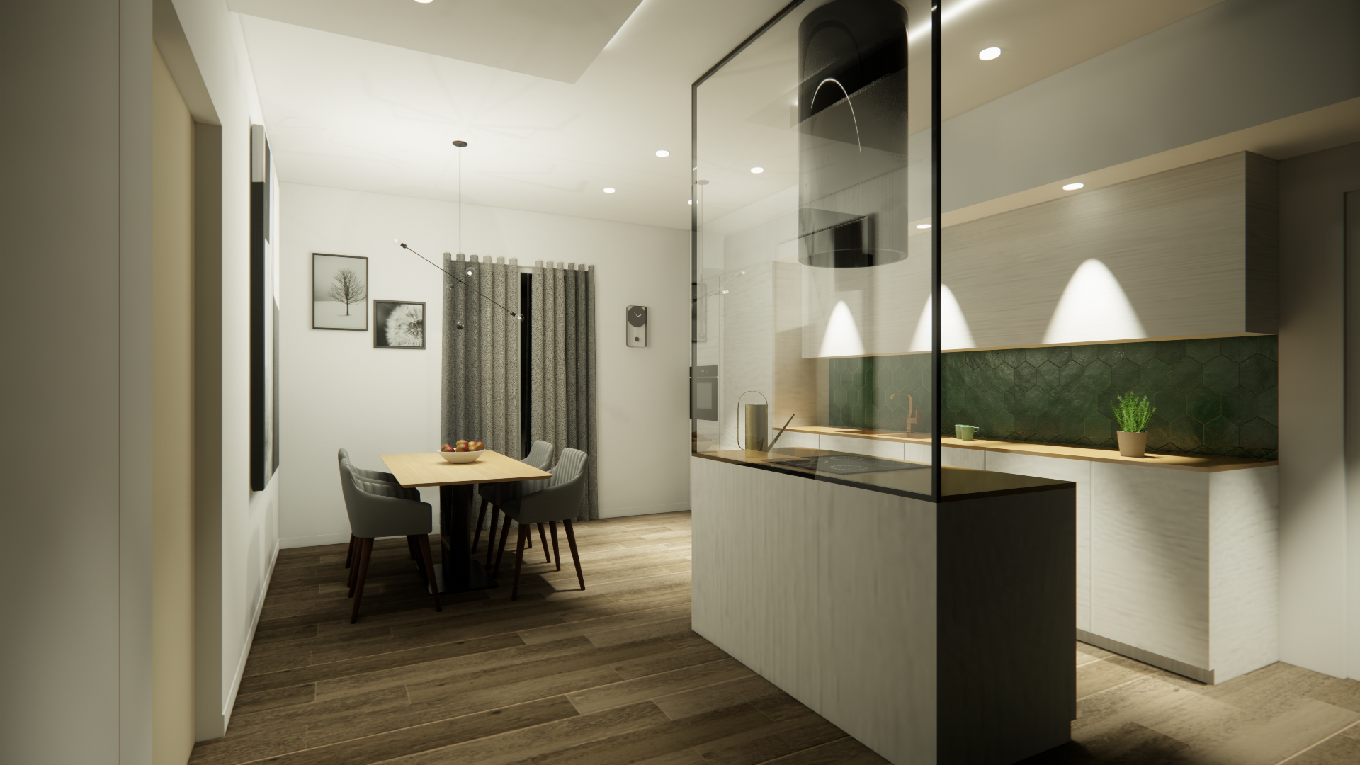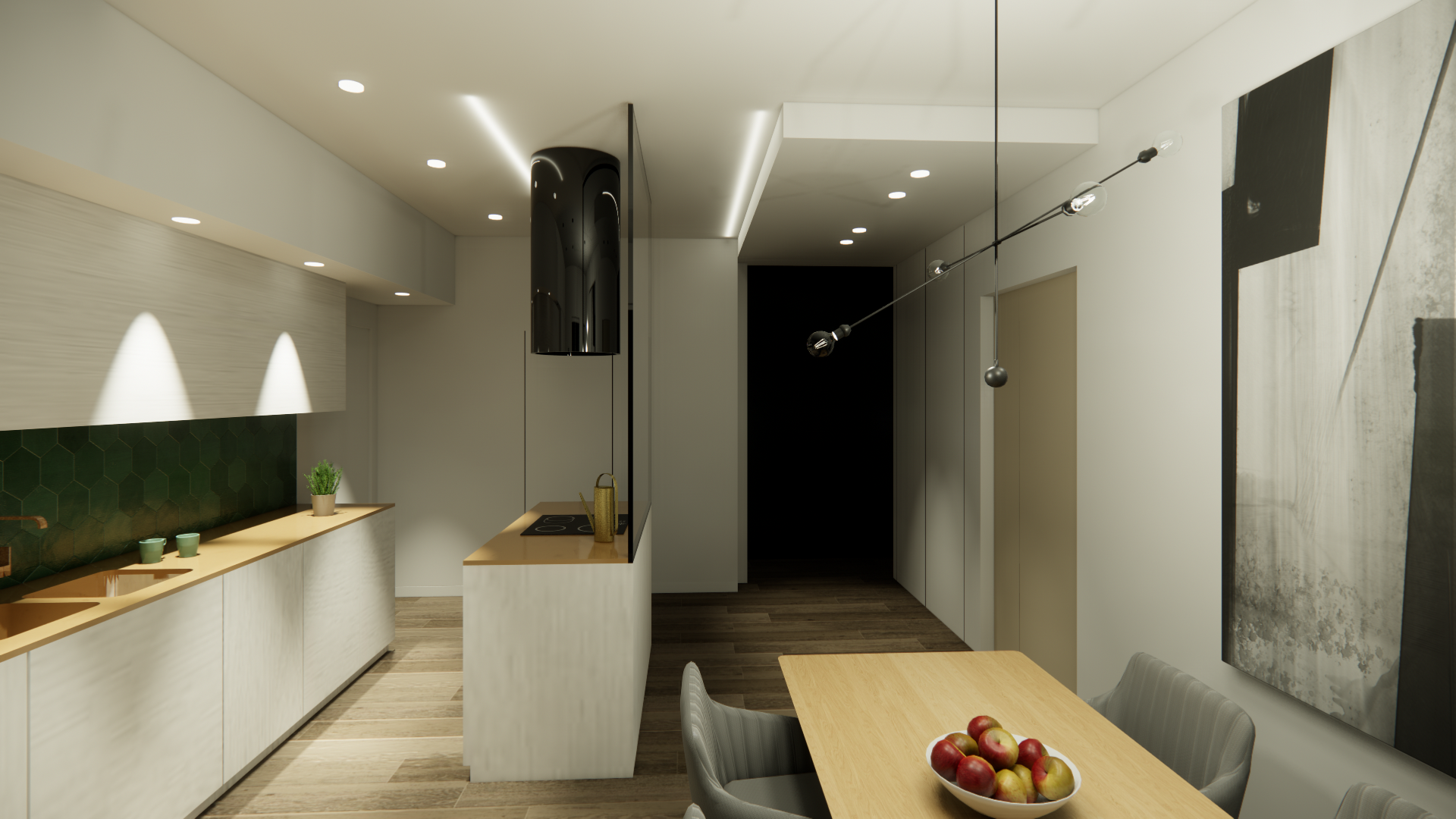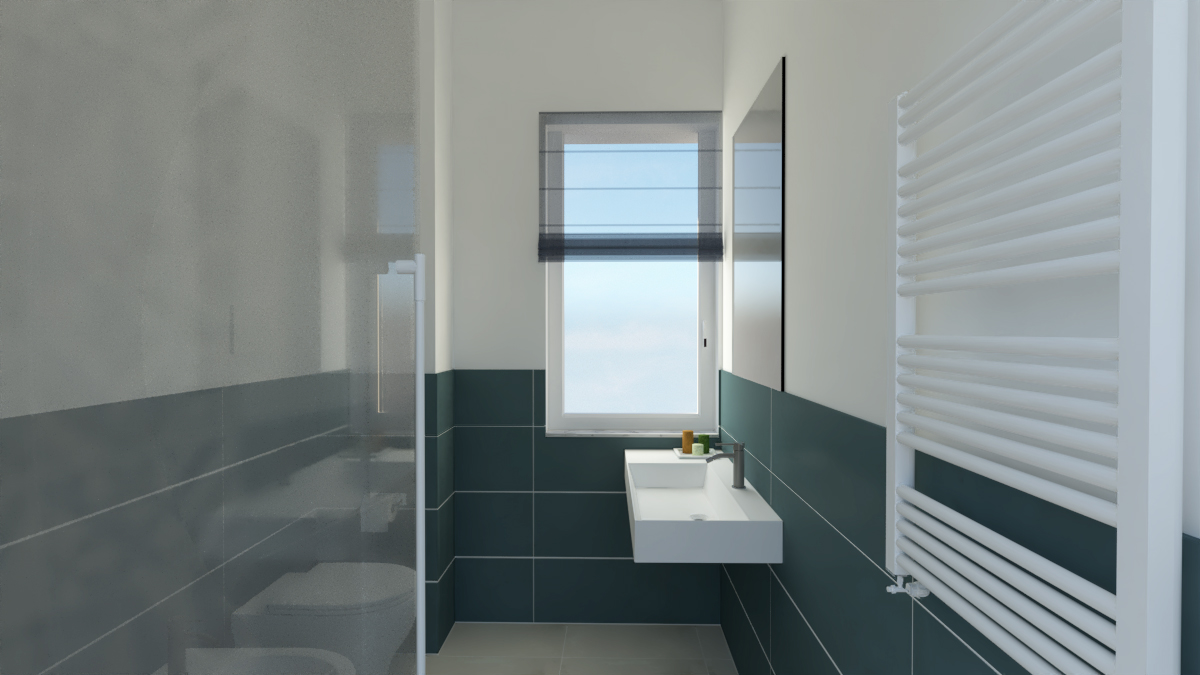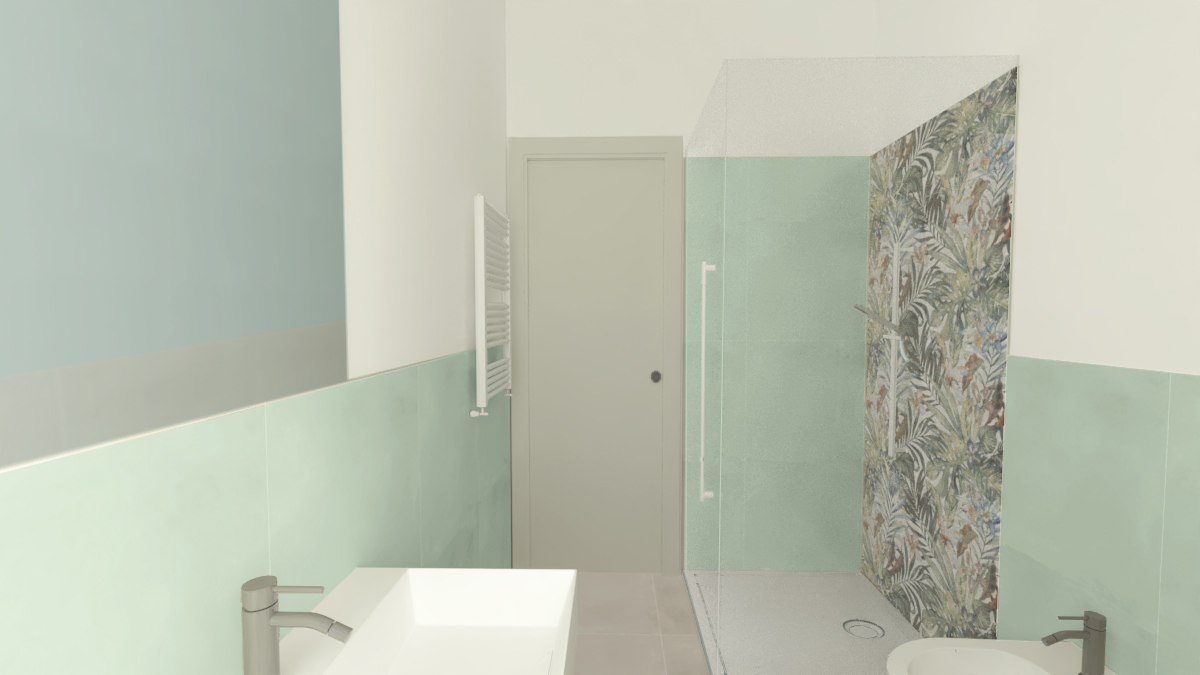 Si prevede di rendere l’accesso all’abitazione totalmente aperto tramite un’ampia zona giorno che connette i due balconi presenti sul fronte sud-ovest e nord-est. Lo spazio è fluido ed unificato dall’uso delle finiture e, al tempo stesso, si differenziano le aree grazie al diverso trattamento dei controsoffitti e della relativa illuminazione, caratterizzando così l’ingresso, la cucina con l’area pranzo e il living.
