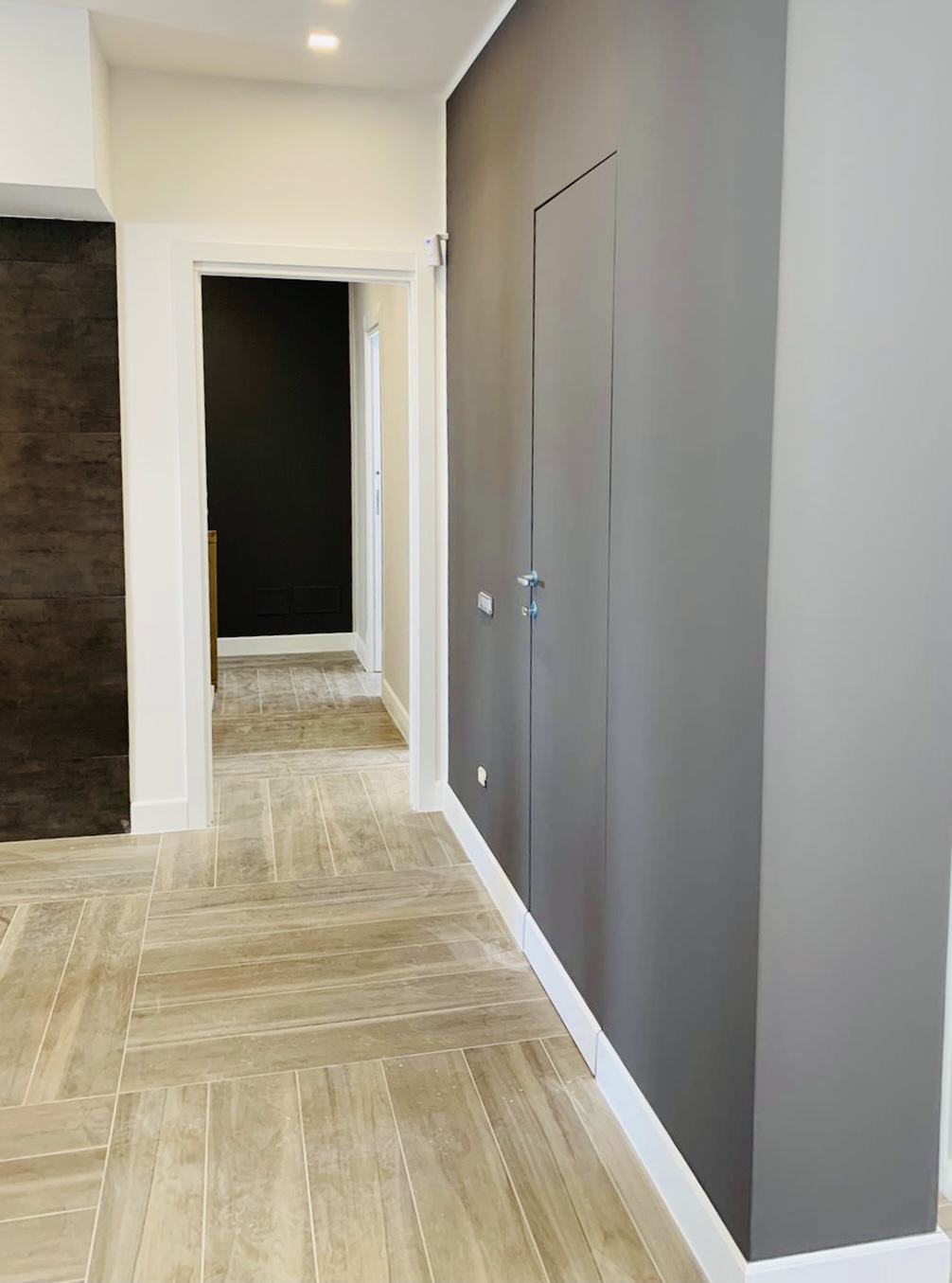 Una porta scorrevole divide la zona giorno dalla zona notte, dotata di due servizi e tre camere da letto connesse tramite un corridoio le cui tinte riprendono i toni dell’open space.
